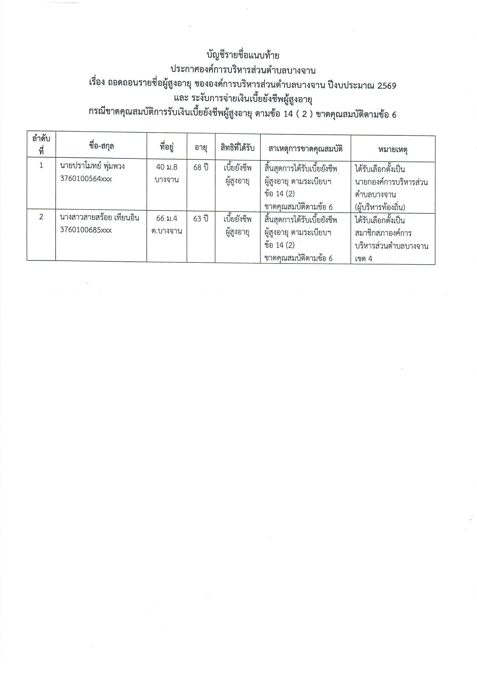 เรื่อง ถอดถอนรายชื่อผู้สูงอายุ ขององค์การบริหารส่วนตำบลบางจาน  ปีงบประมาณ 2569